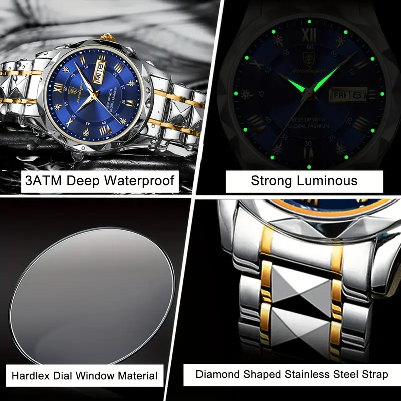 POEDAGAR New Men’s Stainless Steel Quartz Wristwatch, Waterproof Luminous Calendar Men’s Watch