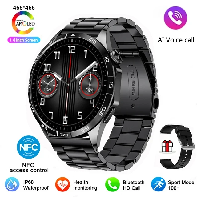 Men's smartwatch with NFC access control, GPS mobile tracking and an AMOLED 466 HD screen showing the time at all times for heart rate monitoring, Bluetooth calling and more.