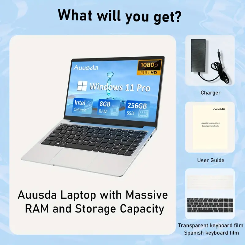 Auusda Laptop Computer With 8GB LPDDR4 256GB SSD, Intel Celeron J4105 Up To 2.5 GHz, 14.1″ 1920×1080 IPS, Webcam, Mini HDTV , USB-A X 2, Micro SD Card Slot, For Windows 11 Pro