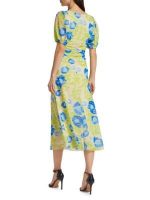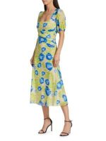 Crafted of an abstract-printed mesh, GANNI’s puff-sleeve midi-dress offers a crisscross bodice and ruched detailing at the sides.