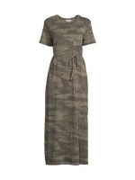 This t-shirt dress in camo print features a crewneck, patch pockets, and a removable waist belt.