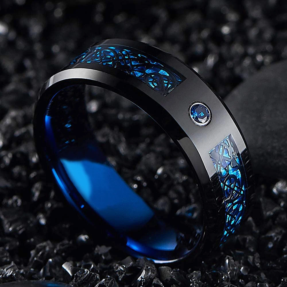 Fashion 8mm Men Red Groove Beveled Edge Stainless Steel Celtic Dragon Ring Zircon Inlay Red Carbon Fibre Ring Men Wedding Band