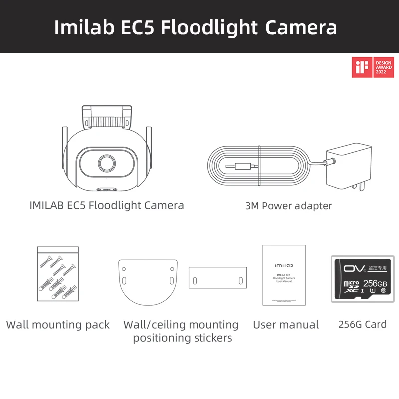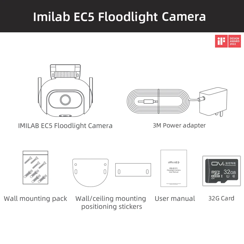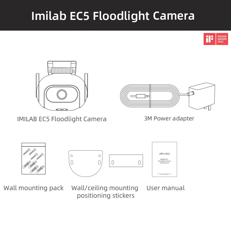 Package Contents: IMILAB EC5 Floodlight Camera*1,Wall mounting pack , Power adapter*1 , User manual*1,Positioning stickers;