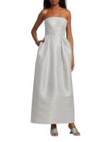 Christopher John Roger’s strapless bell dress features structural pleats at the waist, adorned with a whimsical print.
