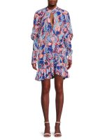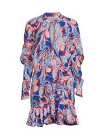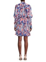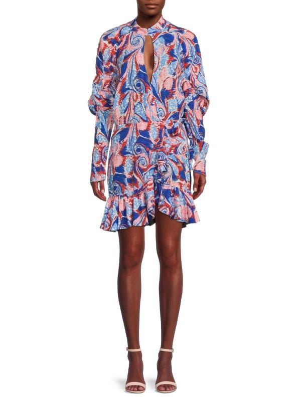 Cut from luxe silk, this ruffled faux wrap dress is elevated with leg-of-mutton sleeves and cascading ruffles.