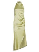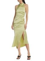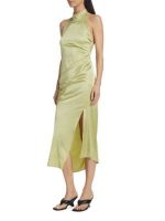 Helmut Lang’s dress is crafted of a luxe silk blend and features elegant draped detailing. A halter neck and side skirt slit completes this sleeveless style.