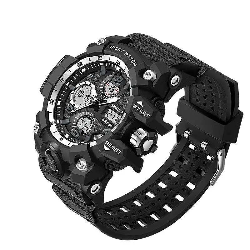 Strap length: 26cm Style: sports Movement: Quartz Movement: Dual display Certification: ce Certification: rohs Waterproof depth: 5bar Button type: buckle Origin: cn (origin) Case material: resin Dial window material type: hardlex Item Type: Quartz Watch Box and box material: no packaging Strap material type: rubber Case shape: round Function: stopwatch Feature: Taillight Features: Anti-seismic Function: led display Features: Luminous Function: automatic date Function: Full calendar