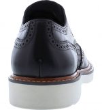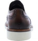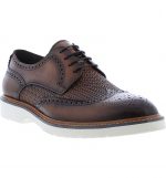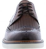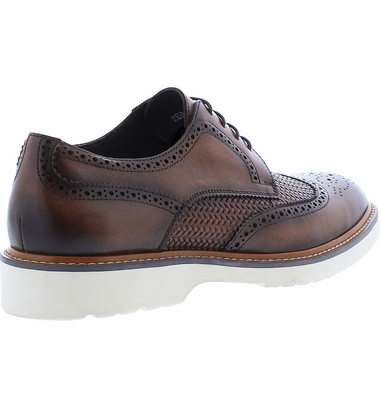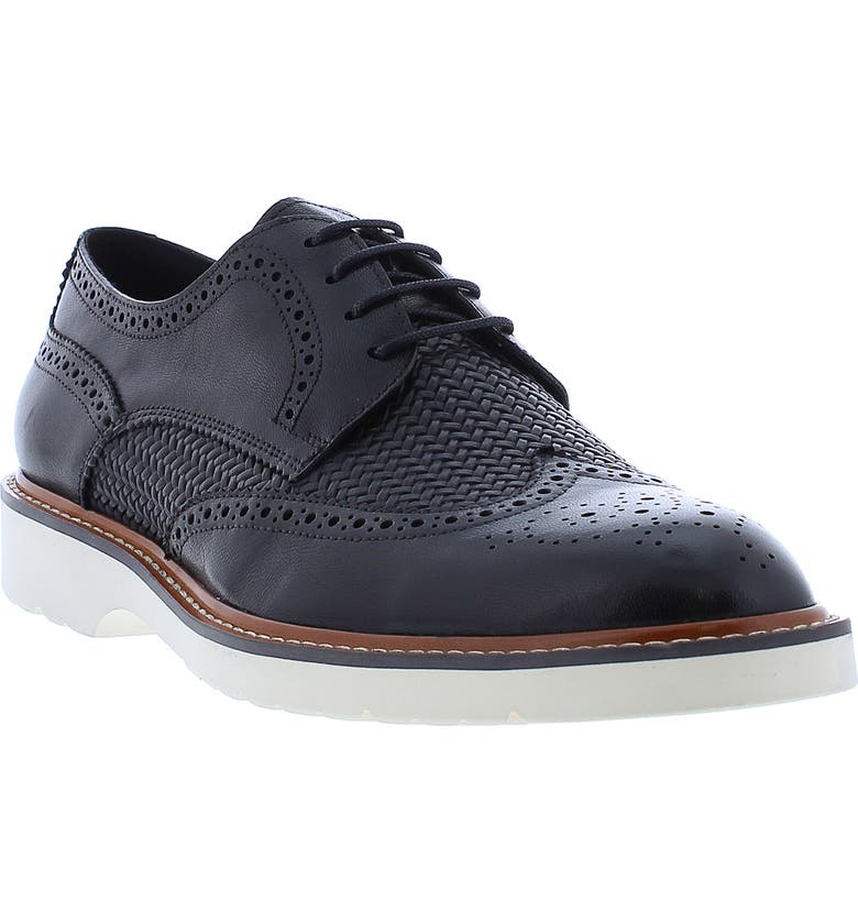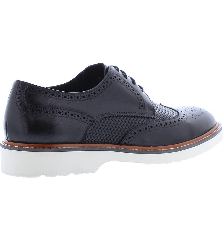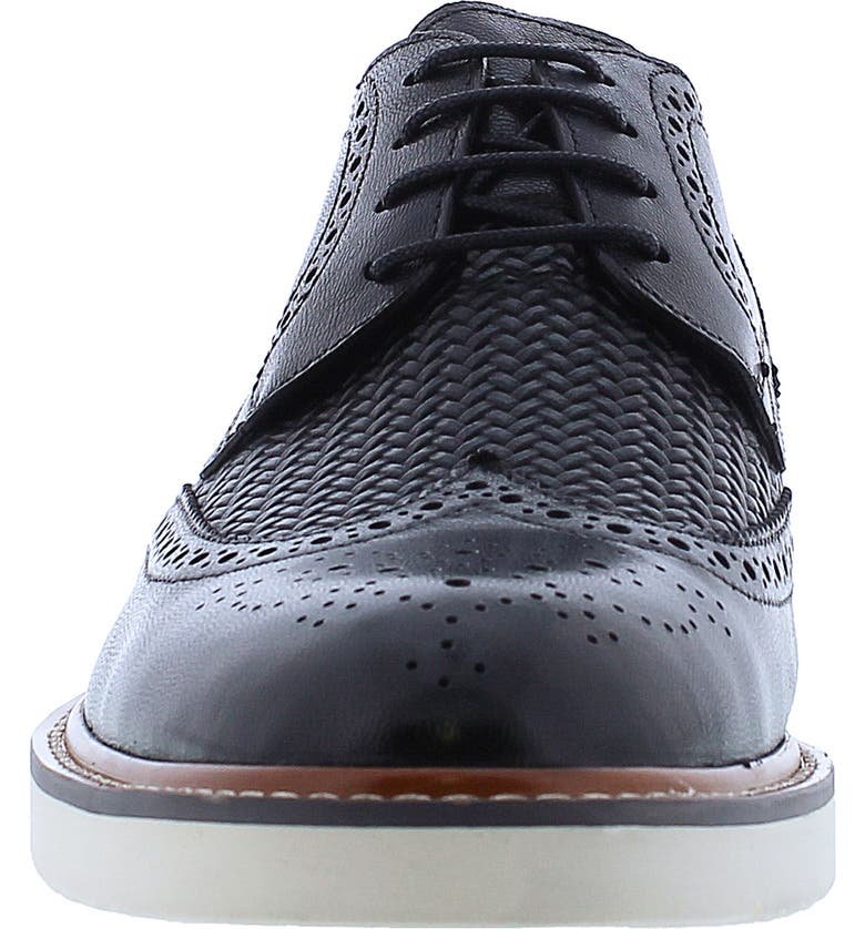 A medallion wingtip toe and elegant broguing elevate a textured leather derby finished with a white grip sole for contemporary style.