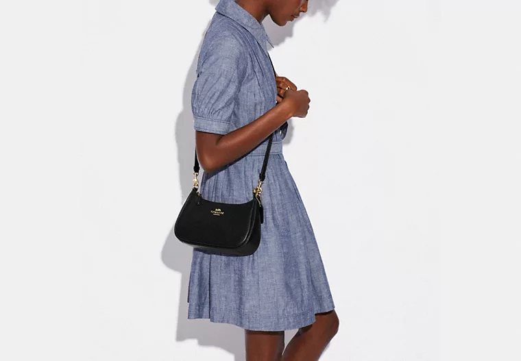 - Detachable strap with 22 3/4″ drop for shoulder or crossbody wear